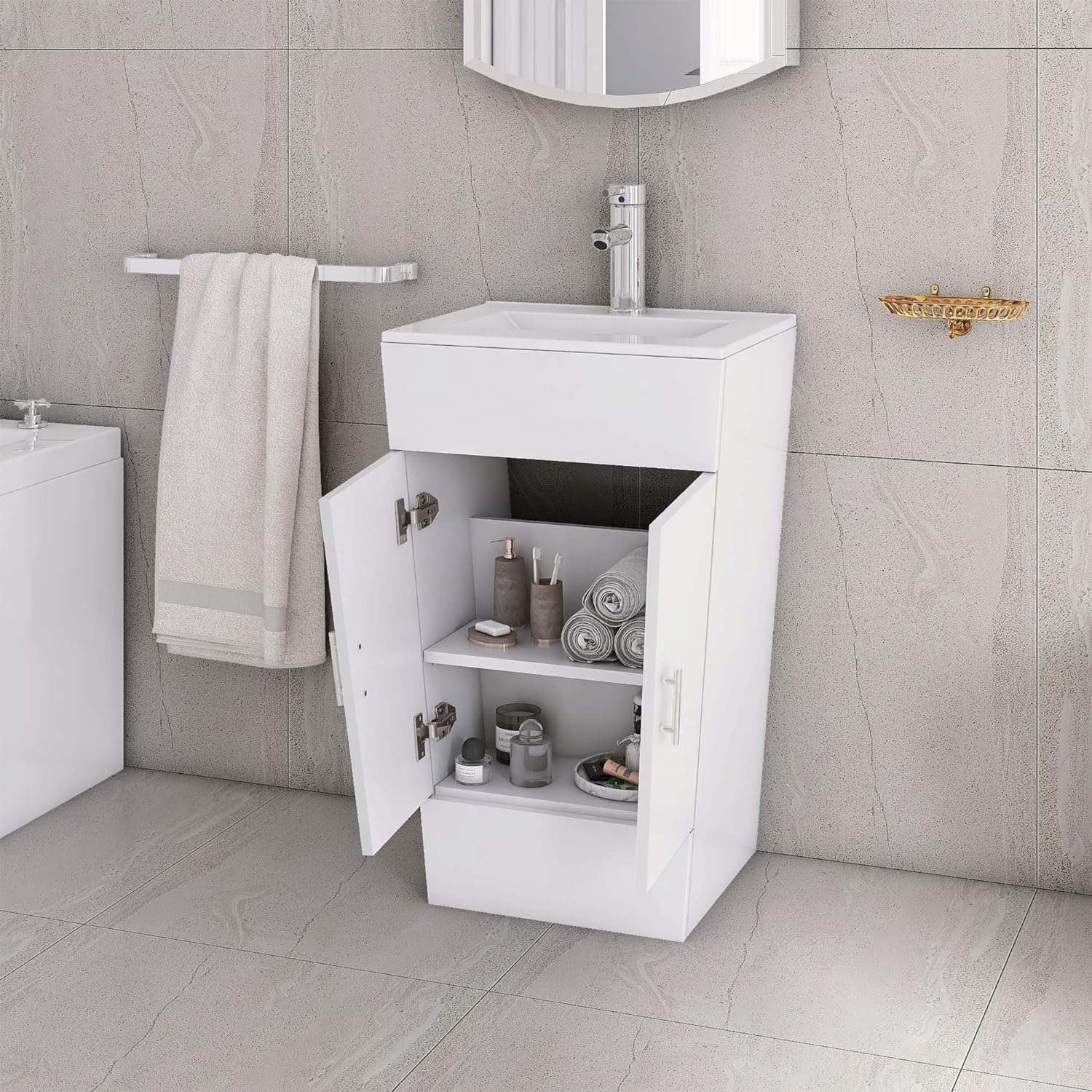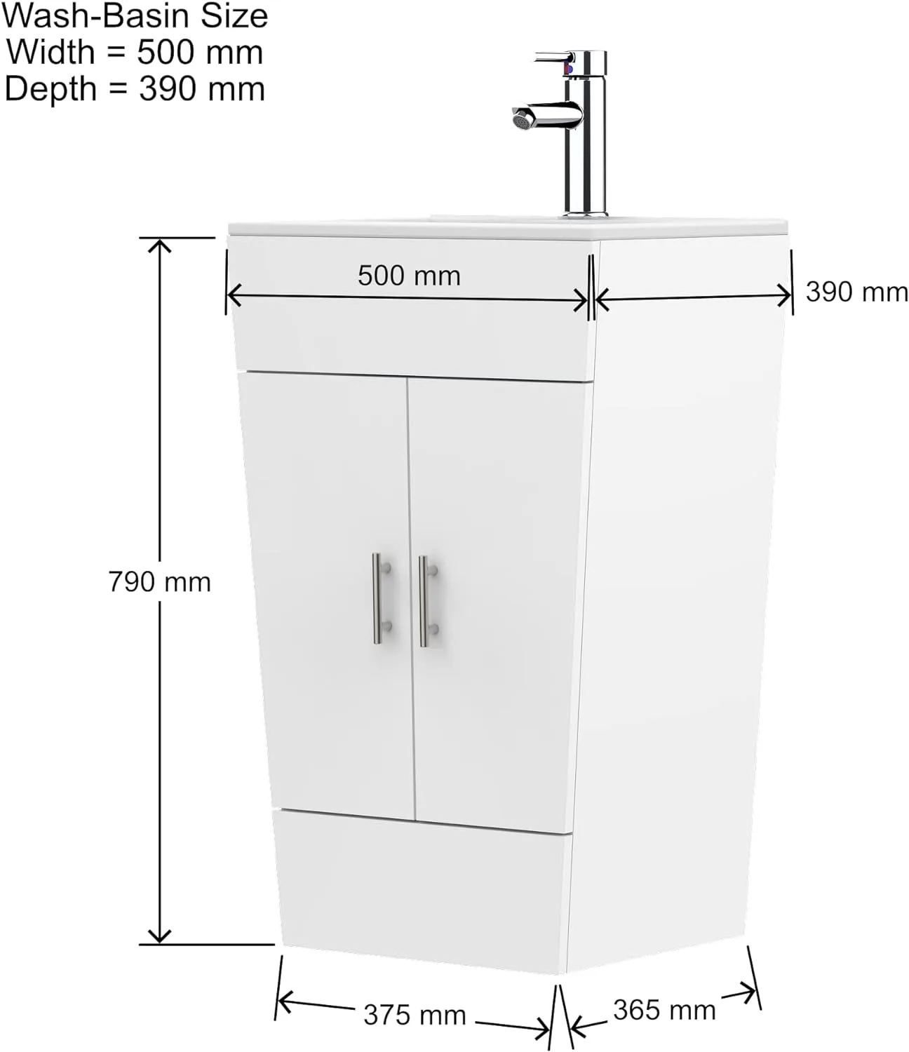 • WHAT’S INCLUDED: 1x Vanity Unit with Soft Close Doors, 1x Ceramic Basin, 1x Tap & Waste, 1x Bottle Drainer.